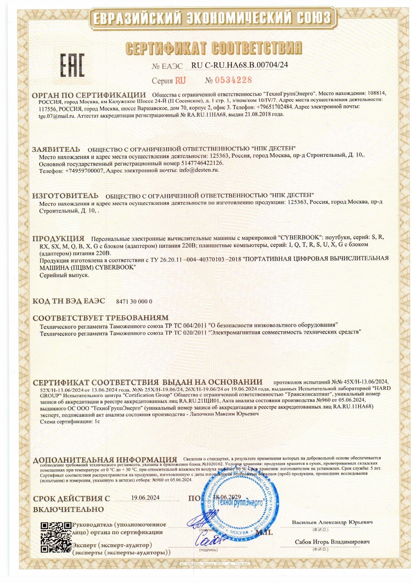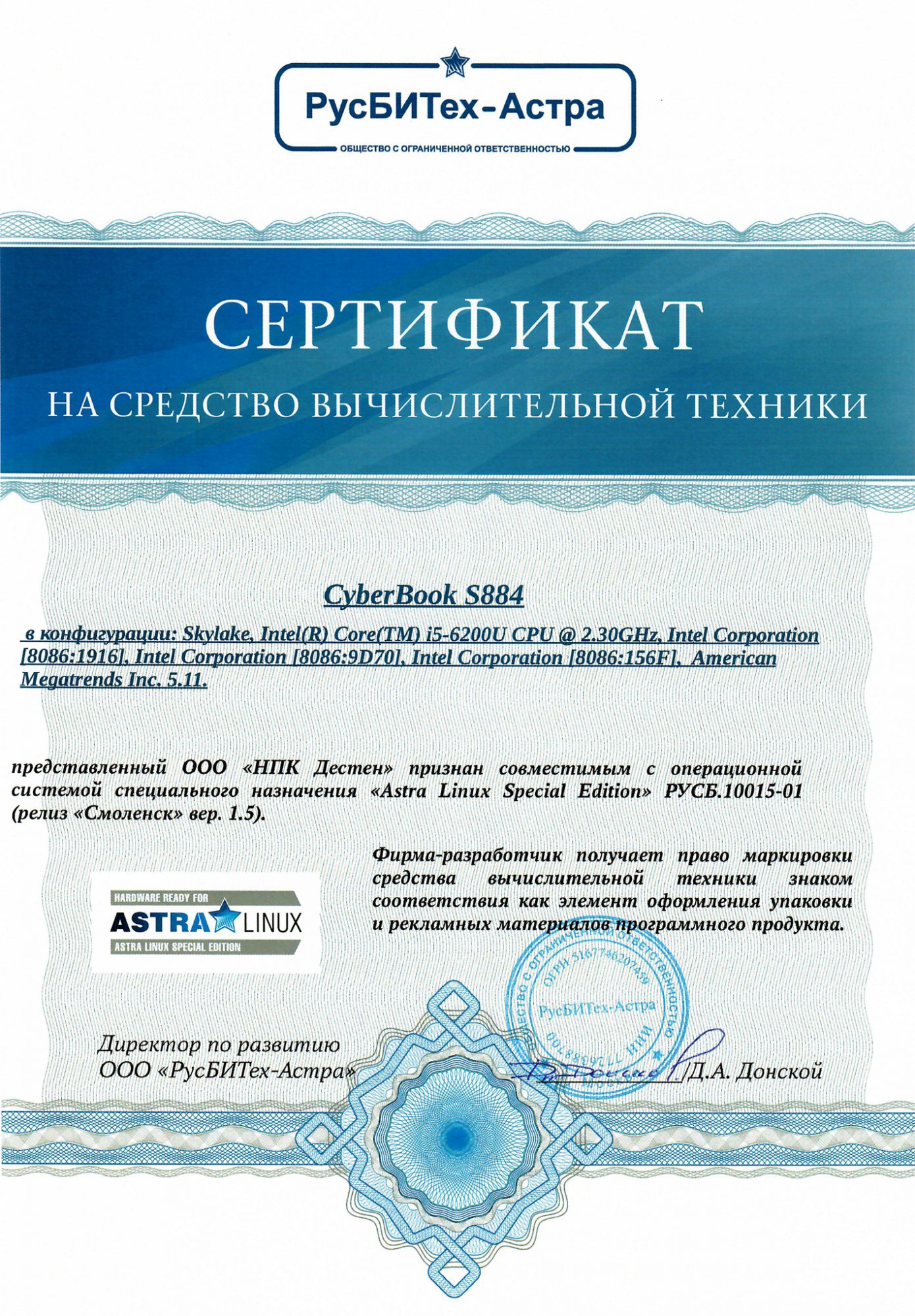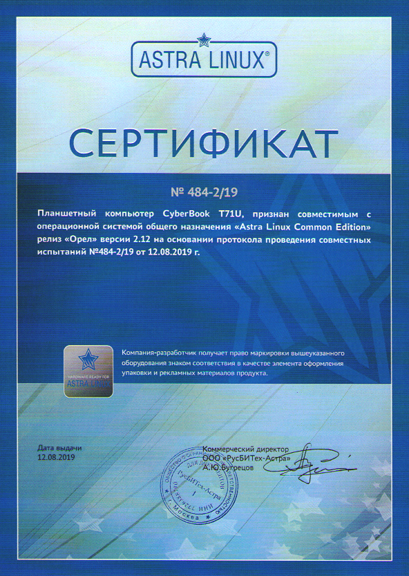 Сертификат совместимости CyberBook S855 с ОС "Astra Linux Special Edition" Смоленск 1.6